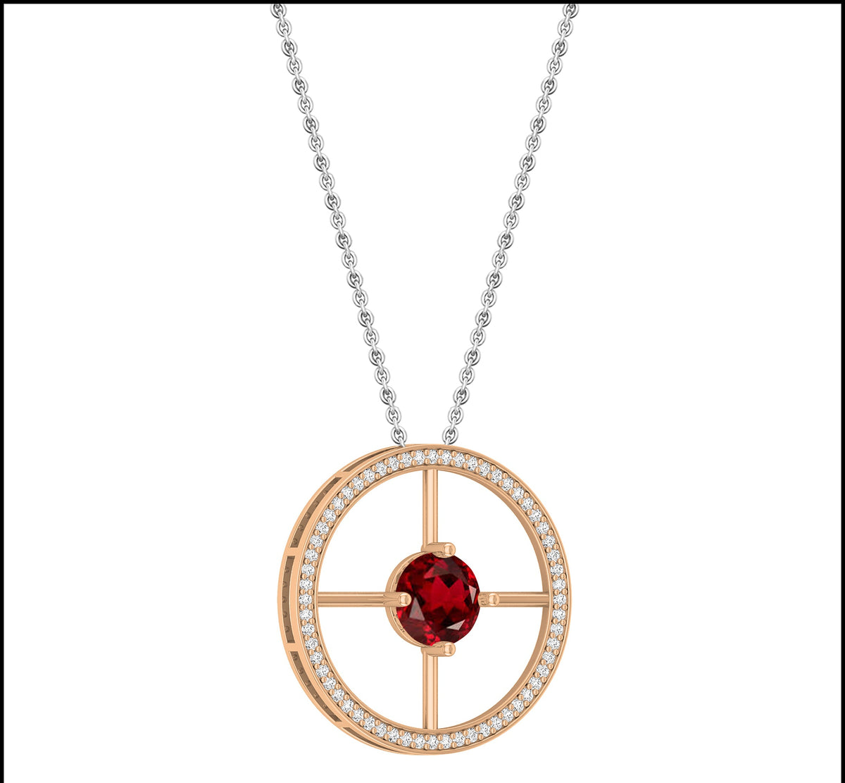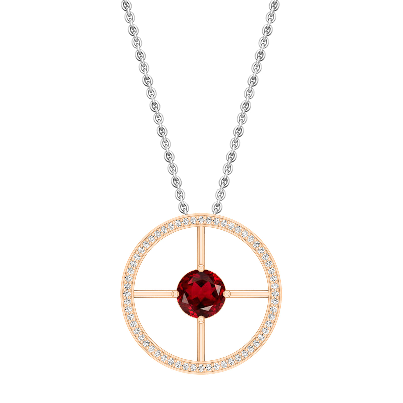 8mm Round Solitaire Garnet & White Diamond Wheel Style Circle Pendant Necklace for Women in 18K Rose Gold
